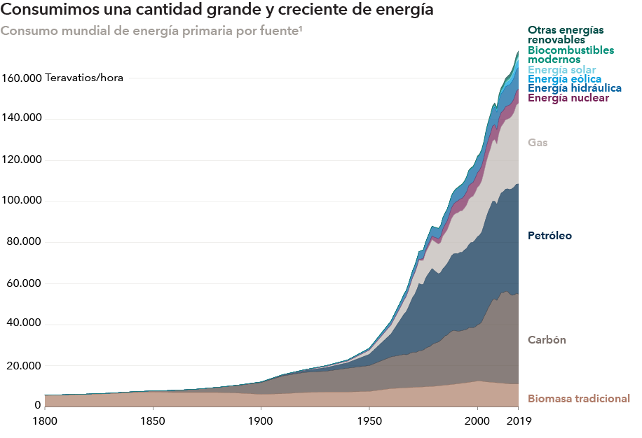 El consumo de energía está muy correlacionado con la riqueza, y la demanda energética seguirá aumentando a medida que se vayan desarrollando los países emergentes. La energía solar y la energía eólica constituyen una parte bastante pequeña de la combinación de energías utilizadas, pero su competitividad en materia de costes, la política gubernamental, la innovación y la profesionalización están impulsando cada vez más la escala y la inversión en estas tecnologías. Podemos comparar la situación actual con otras transiciones energéticas que tuvieron lugar en el pasado, como el auge del petróleo en la década de 1920 o del carbón en la de 1830. Ahora nos encontramos en los inicios de esta fase hacia las energías renovables, los motores que impulsan esta tendencia ya están en marcha, y esta transición constituye un imperativo de supervivencia.