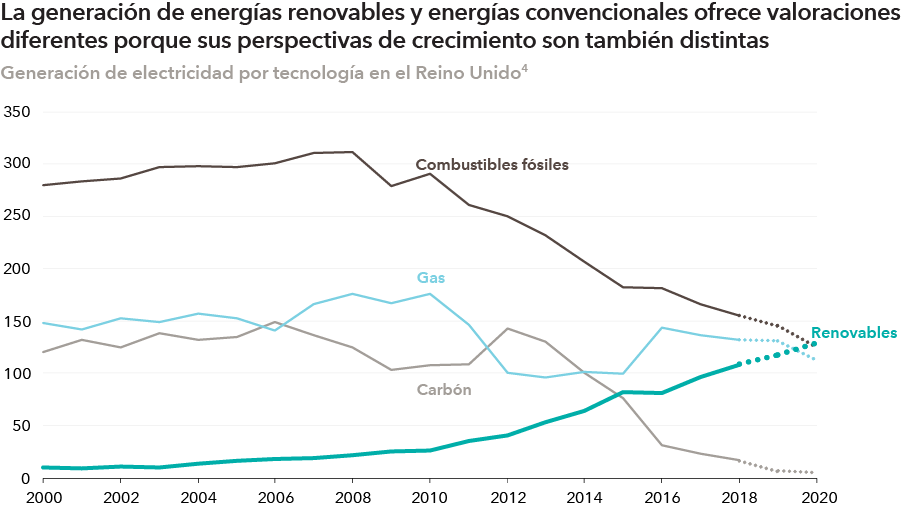 A la hora de considerar cómo va a afectar a las compañías la transición hacia las energías renovables, puede resultar útil prestar atención a los flujos de beneficios más que a la propia compañía. Muchas compañías deben equilibrar la reducción de los beneficios basados en los combustibles fósiles y el aumento de las inversiones en renovables. El mercado preverá el fin de los combustibles fósiles mucho antes de que los ingresos lleguen a cero, lo que se reflejará en las valoraciones de las compañías.