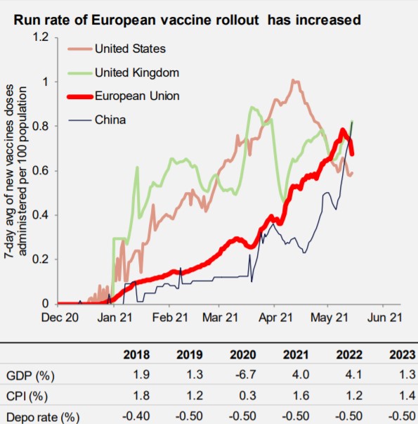 Tras un lento comienzo, el programa de vacunación europeo ha alcanzado por fin su punto de inflexión. La tasa de vacunas administradas per cápita es ahora comparable a la de Estados Unidos, Reino Unido y China (véase el gráfico). Esto debería significar la disminución del número de casos de Covid y la reducción de los confinamientos durante el verano.