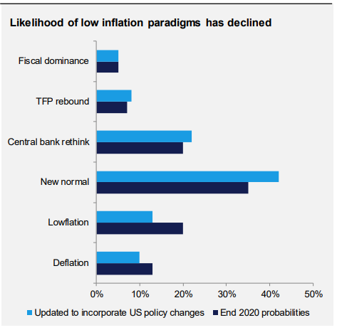 Sin embargo, en EE.UU. el tamaño y la duración del estímulo fiscal nos ha llevado a revisar las probabilidades asociadas a los paradigmas económicos a largo plazo fuera del escenario base. El principal beneficiario de esto ha sido nuestro supuesto de «replanteamiento del banco central», que incorpora que los bancos centrales aumenten implícita o explícitamente los objetivos de inflación, aunque no creemos que esto sea lo suficientemente probable como para convertirse en nuestro escenario base.