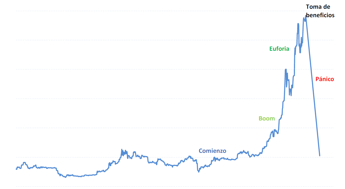 • Pánico: llega el final de la burbuja, con los inversores sufriendo un agresivo desplome de los precios del activo inflado irracionalmente. Al caer el precio los inversores van vendiendo el activo en función de su aguante emocional.