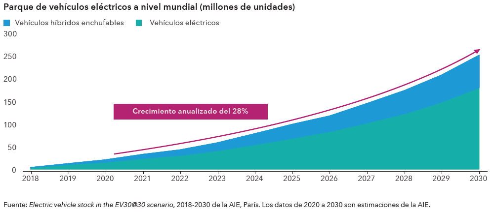 Se prevé que las ventas mundiales de vehículos eléctricos suban un 28% anual durante los próximos diez años, pero creo que podría tratarse de una previsión demasiado conservadora. La rápida disminución de los precios de las baterías y los avances innovadores podrían permitir que los vehículos eléctricos compitieran por precio, no solo con los coches de gasolina, sino con todo el parque automovilístico en circulación, incluidos los coches de segunda mano. Eso son unos 270 o 280 millones de vehículos solo en Estados Unidos. Desde una perspectiva a largo plazo, significa que el crecimiento podría ser mucho mayor de lo que prevé el mercado.