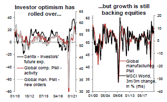 Los indicadores de crecimiento al alza y la fase más madura del ciclo pueden anunciar una mayor volatilidad y retrocesos más frecuentes entre los activos de riesgo. Pero como los inversores ya han frenado su excesivo optimismo y la expansión mundial sigue siendo fuerte, mantenemos un sesgo favorable al riesgo en nuestras recomendaciones tácticas. Las mejoras de los beneficios empresariales siguen siendo tranquilizadoras. La caída de los rendimientos reales (de nuevo por debajo del -1% a 10 años en EE.UU.) apuntala las valoraciones de la renta variable, y las primas de riesgo de la renta variable siguen siendo favorables.