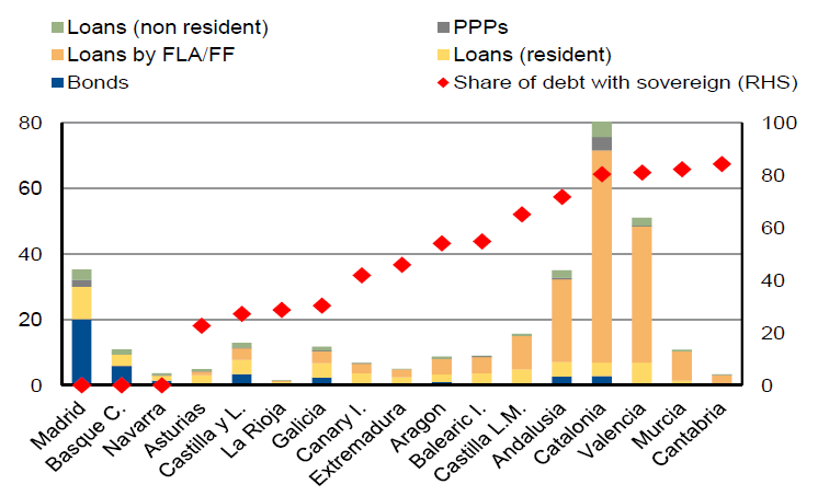 Los préstamos soberanos se convirtieron en la principal fuente de financiación de las regiones españolas cuando la crisis de deuda de la zona euro dificultó el acceso a los mercados de capitales. Pero en los últimos años, las regiones que cumplen los objetivos fiscales fijados por el gobierno central han vuelto gradualmente a los mercados de capitales para reemplazar parte de la deuda con el gobierno central y beneficiarse del descenso de los costes de los intereses.