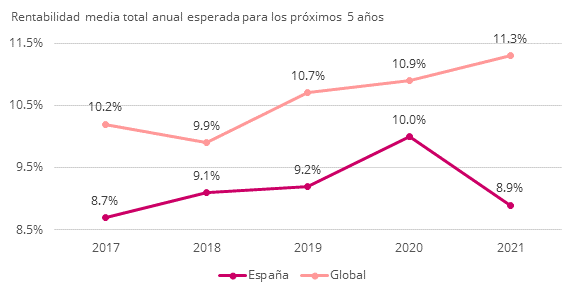 Esta tendencia también se da en Europa, con unas expectativas del 9,7% frente al 9,3% de 2020. Sin embargo, entre los inversores españoles sucede lo contrario: más de un año después del inicio de la pandemia, la situación económica y social parece haber reducido su optimismo, ya que sus expectativas de rentabilidad son menores (8,9% vs 10% en 2020). Además, ahora los españoles se encuentran entre los inversores con unas expectativas de inversión más bajas, tanto a nivel global como de Europa. A nivel mundial, sólo los inversores japoneses y canadienses esperan obtener rentabilidades menores (8,5% y 8,6%, respectivamente), mientras que, en Europa, los españoles sólo están por delante de los alemanes e italianos (8,6% y 8,2%, respectivamente).