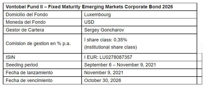 El Vontobel Fund II – Fixed Maturity Emerging Markets Corporate Bond 2026 invierte principalmente en bonos corporativos de mercados emergentes con vencimientos cortos y medios. El fondo tiene un vencimiento fijo de cinco años con una calificación crediticia media de grado de inversión y un objetivo de rendimiento al vencimiento del 4,7%.