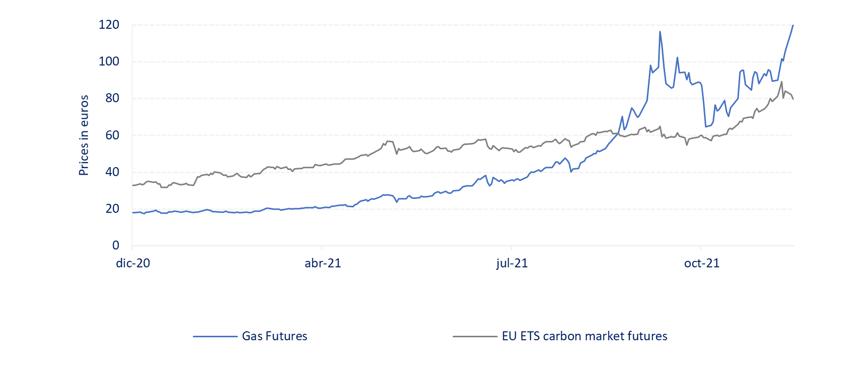El aumento del precio del gas y de las emisiones de gases de efecto invernadero de las compañías eléctricas, junto con la reducción de la oferta de créditos de carbono (cada crédito equivale a una tonelada de dióxido de carbono que se deja de emitir a la atmósfera), han llevado el precio del carbono en el mercado regulado europeo a un nivel insostenible a corto plazo (el precio del carbono está actualmente desvinculado de nuestras capacidades de transición energética). A este respecto, identificamos varios puntos de atención para 2022: