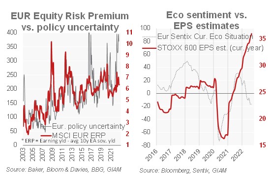 Las pérdidas de la renta variable este año han reflejado una caída de la valoración (múltiplos) por el aumento de los rendimientos, pero las primas de riesgo de la renta variable no han cambiado mucho. Sin embargo, la extrema incertidumbre política (la Fed y el BCE han abandonado el forward guidance, Ucrania, la energía) favorece el aumento de las primas (gráfico). La disociación entre el sentimiento económico y las expectativas de beneficios (gráfico) puede explicarse, pero no sostenerse. O bien las empresas siguen disfrutando de un fuerte poder de fijación de precios, en cuyo caso los bancos centrales irán mucho más allá de la neutralidad, o bien no lo hacen, y la desaceleración/recesión afectará a los beneficios.