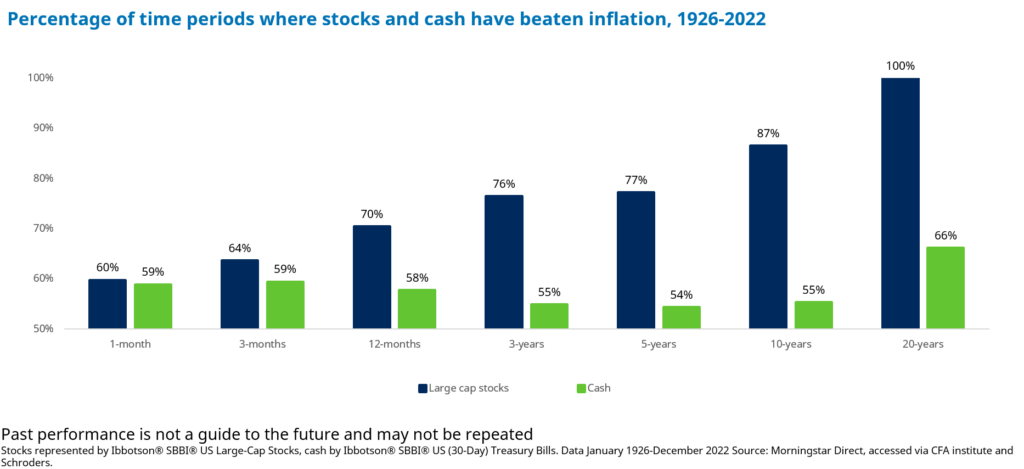 Los resultados son contundentes. El gráfico muestra que en periodos muy cortos -tres meses o menos- no ha habido mucha diferencia en la probabilidad de que el efectivo o las acciones superen a la inflación. Pero, para periodos más largos, la diferencia se amplía de forma concluyente.