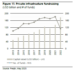 En 2022, las infraestructuras privadas registraron un récord de captación de fondos, con 180.000 millones de USD, aunque el número de fondos que captaron capital se situó casi en su nivel más bajo de los últimos 10 años (Gráfico 15), ya que predominaron los megafondos.
