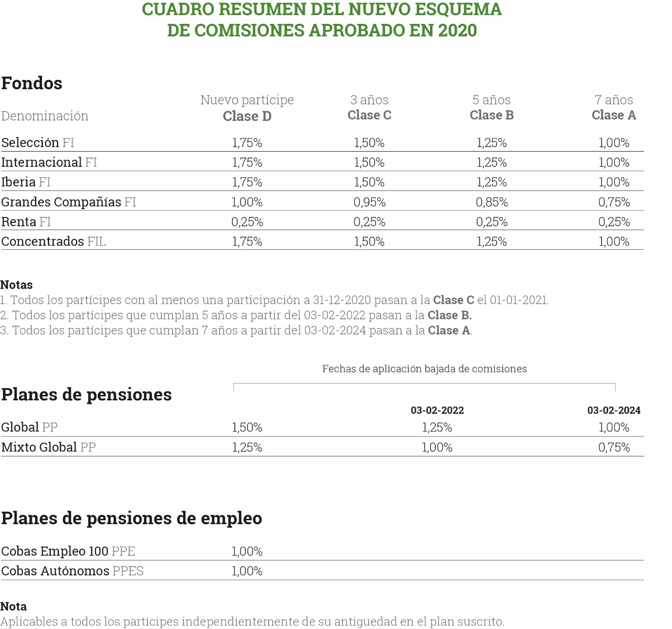 Igualmente, para aquellas empresas que quieran contribuir al ahorro complementario de sus empleados o autónomos que quieran beneficiarse de las ventajas fiscales existentes en los planes de pensiones de empleo, Cobas Pensiones cuenta con el plan de empleo Cobas Empleo 100, PPE y Cobas Autónomos PPES, cuya comisión es del 1%.