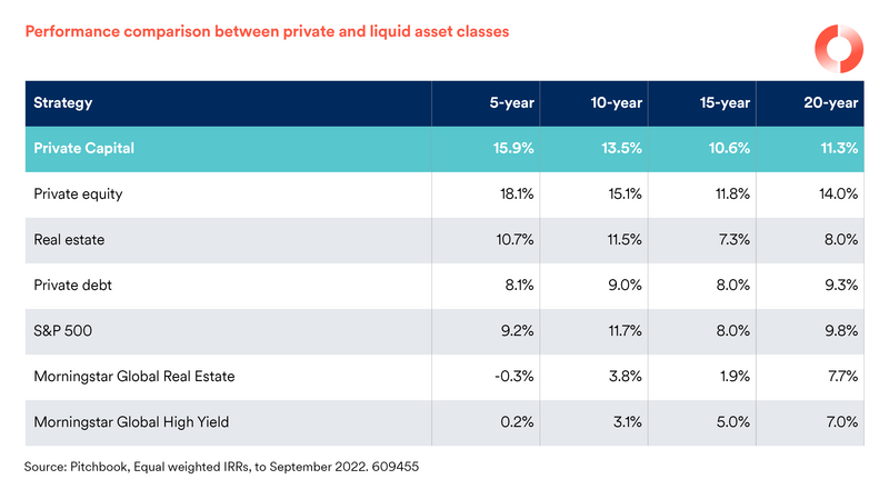 La rentabilidad histórica de numerosas clases de activos privados se compara favorablemente con la de inversiones líquidas, como la renta variable y la renta fija tradicionales, en horizontes de inversión más largos.