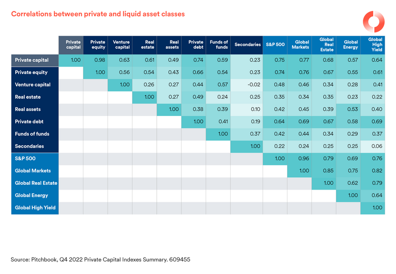 Medir cómo se mueven las distintas inversiones entre sí -la correlación- es crucial para crear una diversificación significativa. Una vez más, los datos indican que los activos privados pueden contribuir a la diversificación de las carteras.