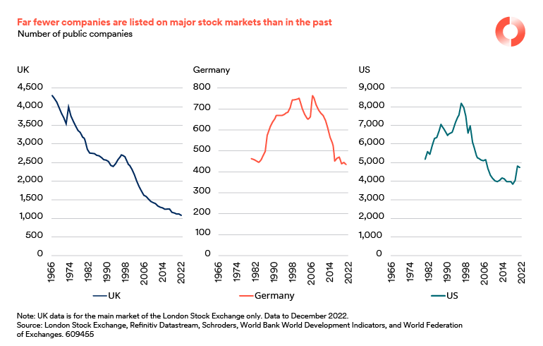 En 1996 había más de 2.700 empresas en el mercado principal de la Bolsa de Londres. A finales de 2022 se habían reducido a 1.100, un 60%. El número de empresas que cotizan en el Reino Unido ha caído casi un 75% desde los años sesenta. Alemania ha perdido más del 40% de sus empresas públicas desde 2007 y Estados Unidos ha experimentado una caída del 40% desde 1996.
