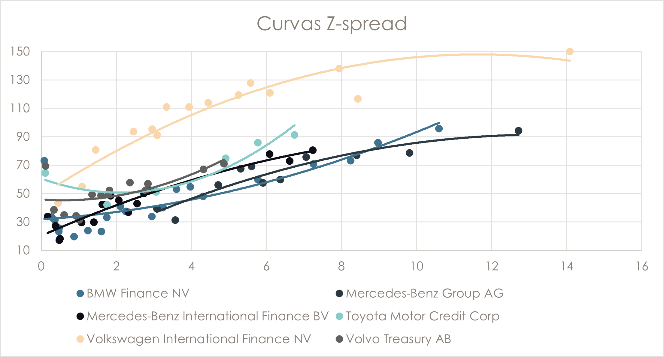 Gráfico de análisis del spread relativo entre distintos emisores del mismo sector. Se utilizan ésta y otras herramientas para encontrar los bonos más atractivos para la inversión.
